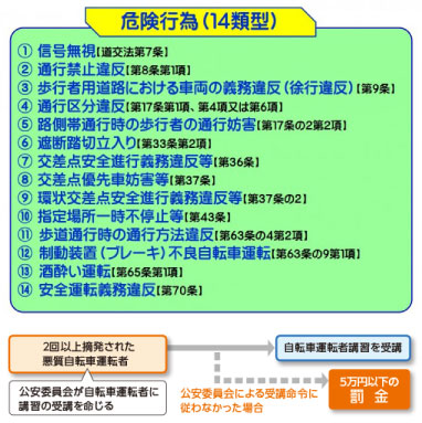 一定の危険な違反行為をして2回以上摘発された自転車運転者(悪質自転車運転者)は、公安委員会の命令を受けてから3ヵ月以内の指定された期間内に講習を受けなければいけません。