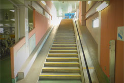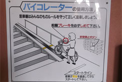 入庫時はバイコレーターを使用してください。出庫の際は、階段右側の坂を降りて下ってください。