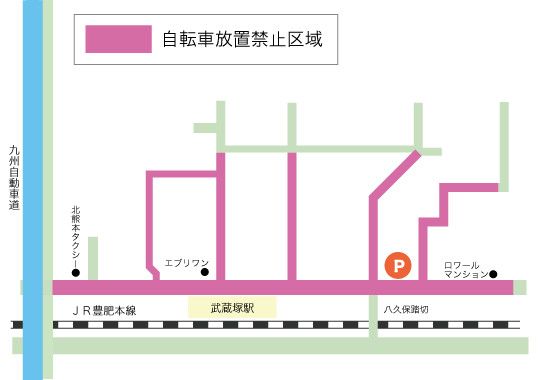 JR武蔵塚駅周辺の自転車放置禁止区域は、下記の地図のピンク色の部分となっており、放置されている自転車は即時撤去を行っています。なお、返還の際には移動保管料(1,500円)をいただきます。